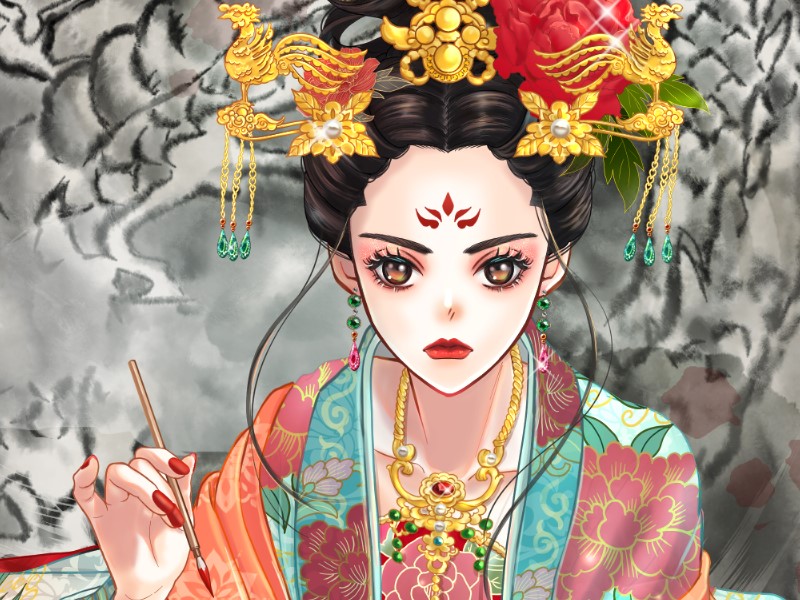 絵筆を持ち、厳しい表情で正面を見据えるのはヒロイン柳碧蘭です。